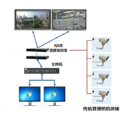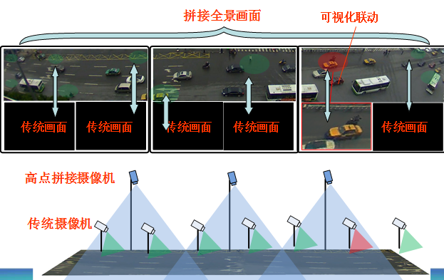 1)采用传统普通枪机的拼接低点联动指的是在原有监控环境下增加少量高点枪机监控头,拼接