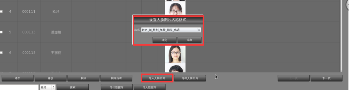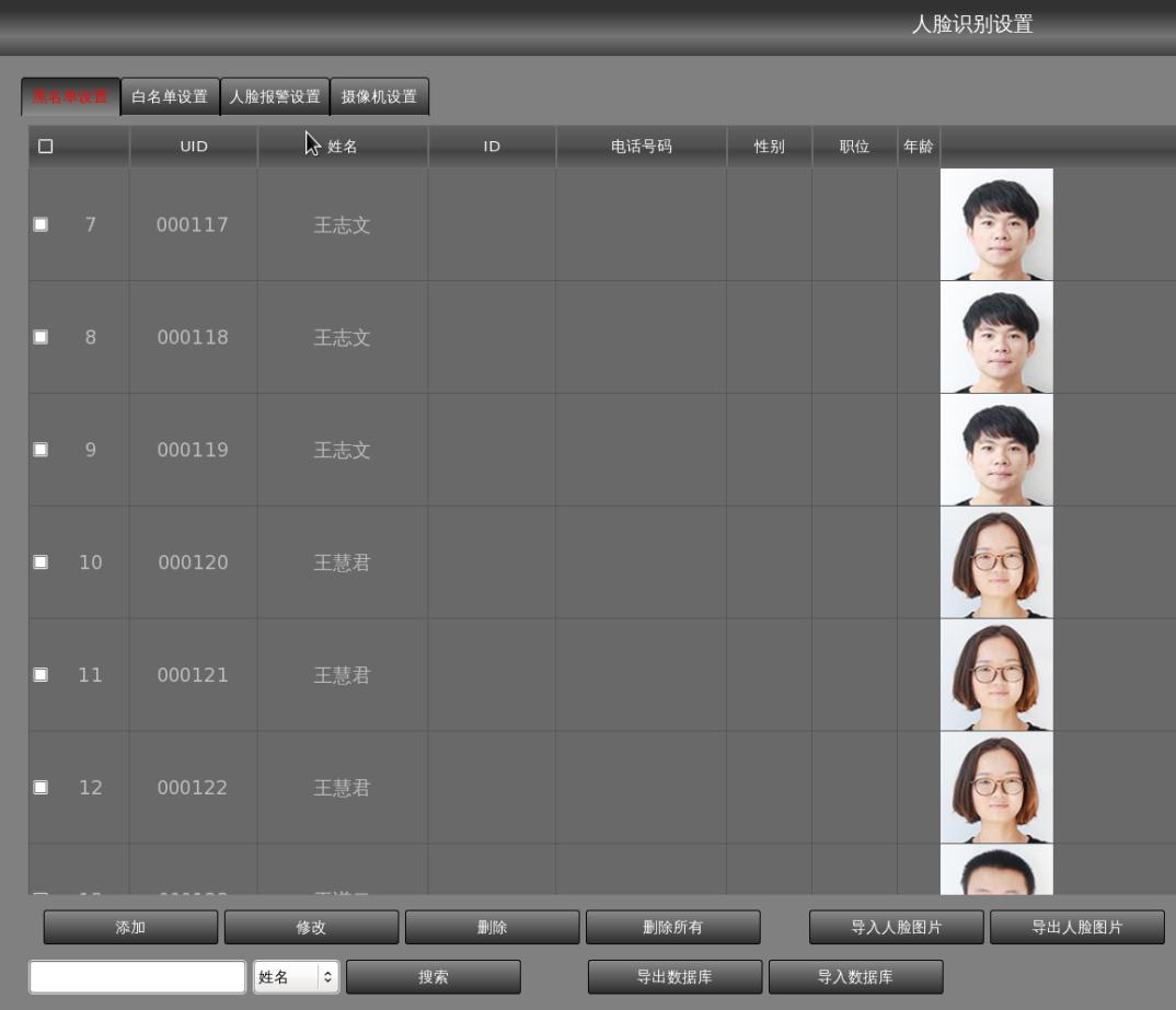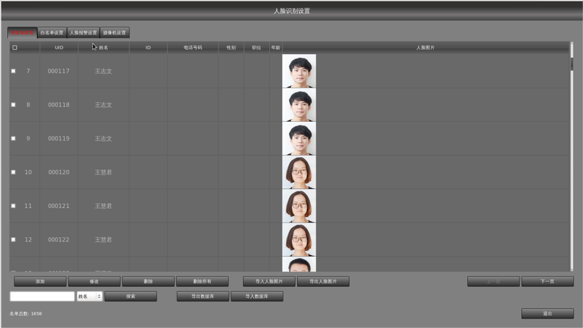 针对各个不同的人脸库,查询符合条件下的人员信息,并对其中的信息进行修改删除等操作,同时也可针对勾选的人脸库进行新人员信息的注册。