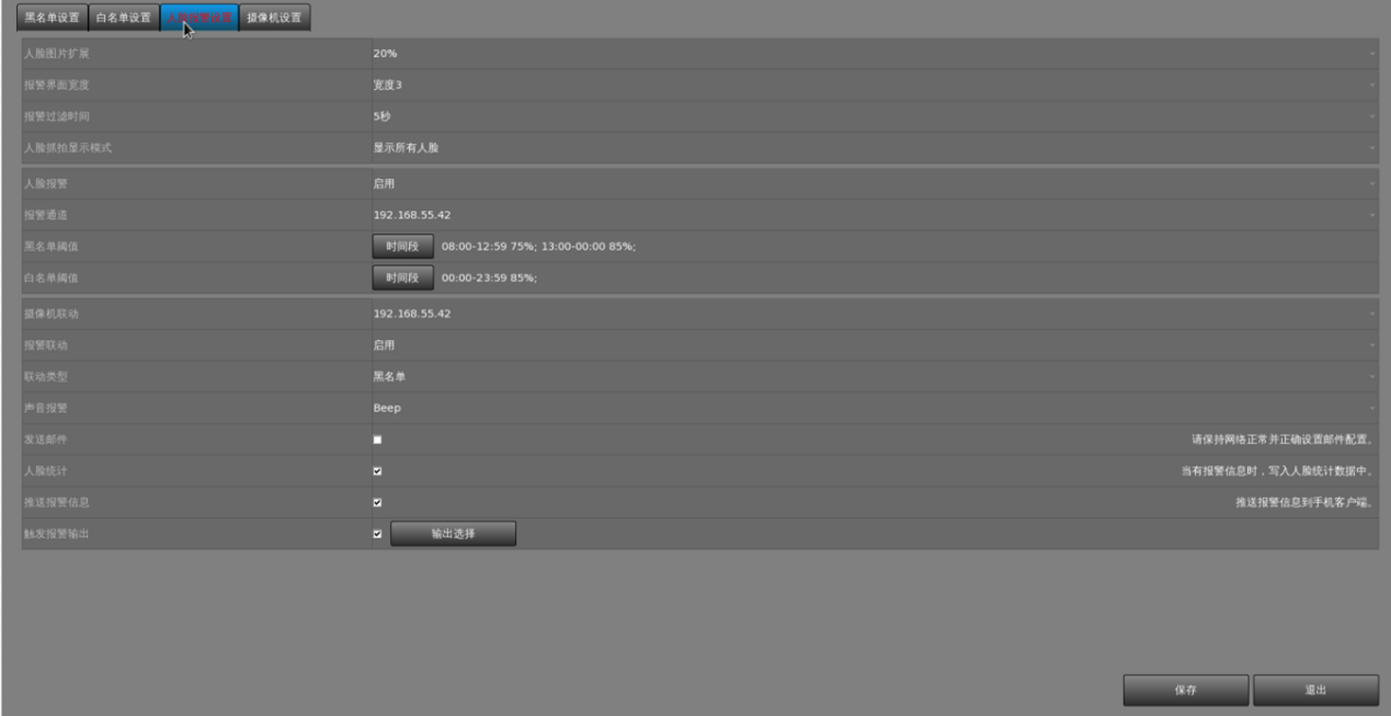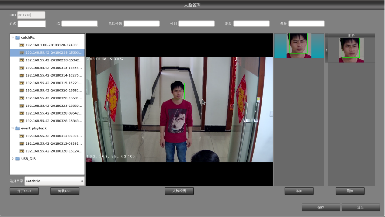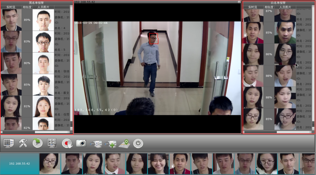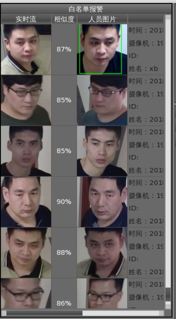 实时提供监控画面,并显示所有的报警结果。保存所有经过摄像头的人脸照片,每张照片只有几K到十几K大小。
