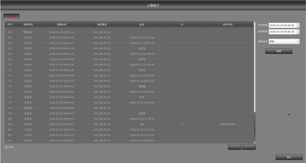 在来往旅客中,如有可疑人员和高危人员来往来。把此类人员入库到固定黑名单库中。当此类人员光顾时,人脸识别为黑名单库中人员,并产生报警声音,用来提醒员工及时作好各种应急预案,以防出现各种不良事件。